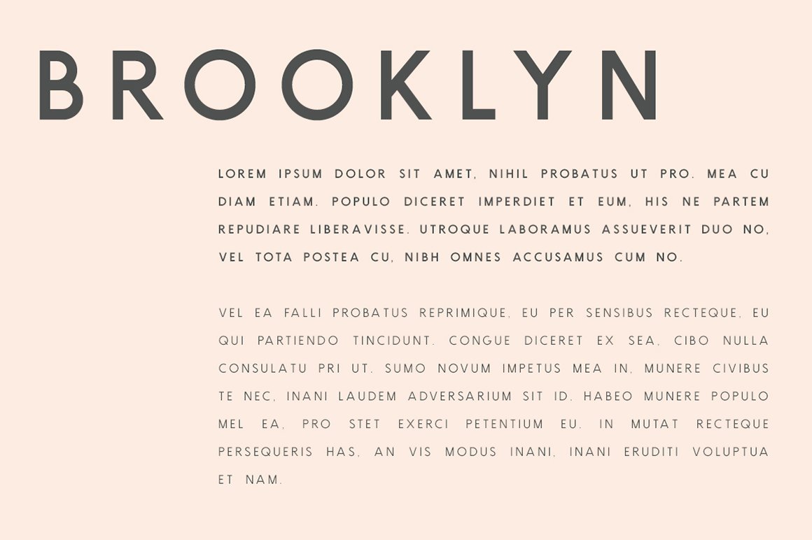 Brooklyn is a stunning all-caps sans serif that comes in two beautiful weights to complement every project you’re working on. Resembling a cross between Futura and Gotham, Brooklyn will very easily become a staple in your type kit. Use to create beautiful headings, gorgeous invitations, stunning logos, and so much more!! I think Brooklyn looks best with wide-set spacing (headers on sample images feature spacing set around 500). You can recreate the spacing in the sample bar below by including spaces between each of your letters.