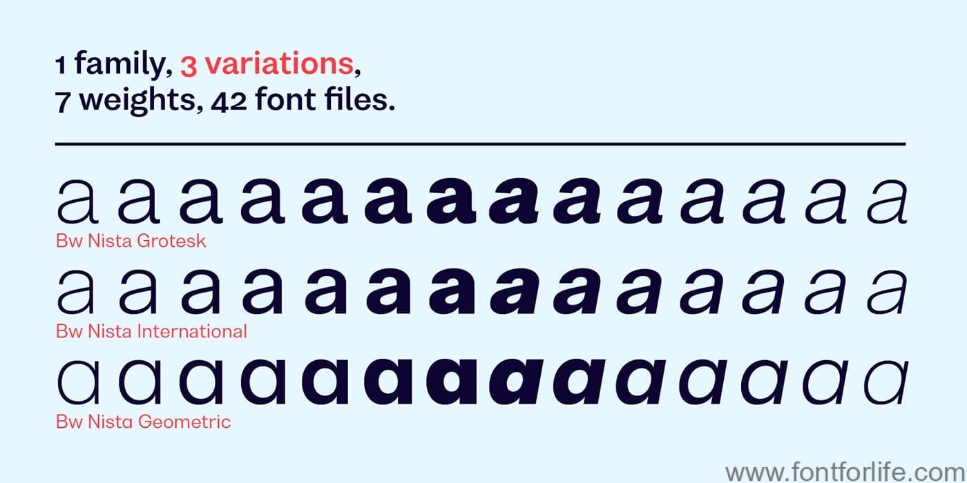 I am very happy that lucky to be introduced to you a great fonts family. This is a family of fonts with 3 variations, 7 weights, 42 font files. Introducing Bw Nista Font Family! Bw Nista designed and shared by Alberto Romanos. Bw Nista is a clean modernist sans serif font family. Designed to provide a neutral tone of voice, it comes in three different sets each with subtle features portraying different personalities.