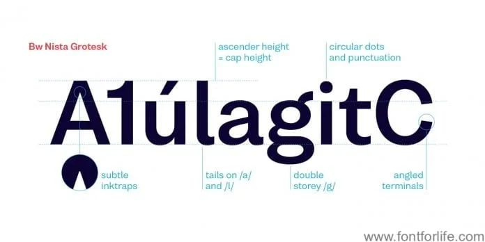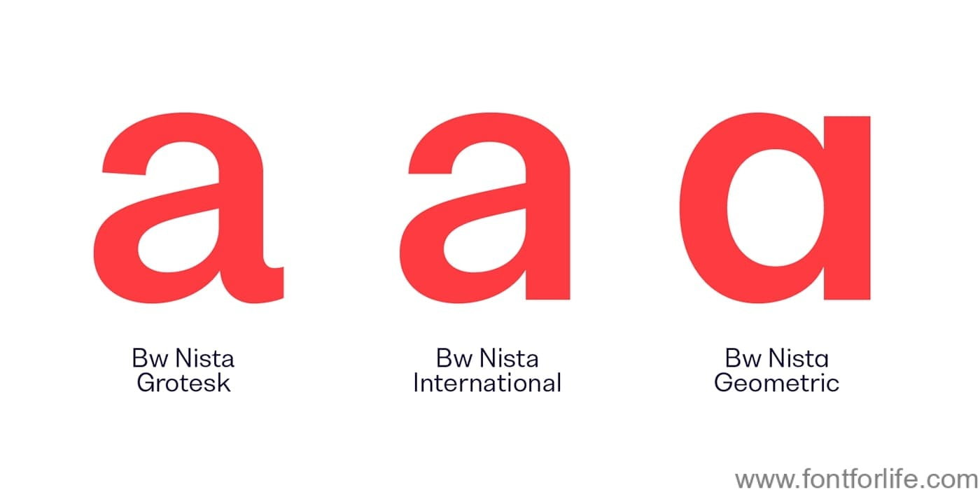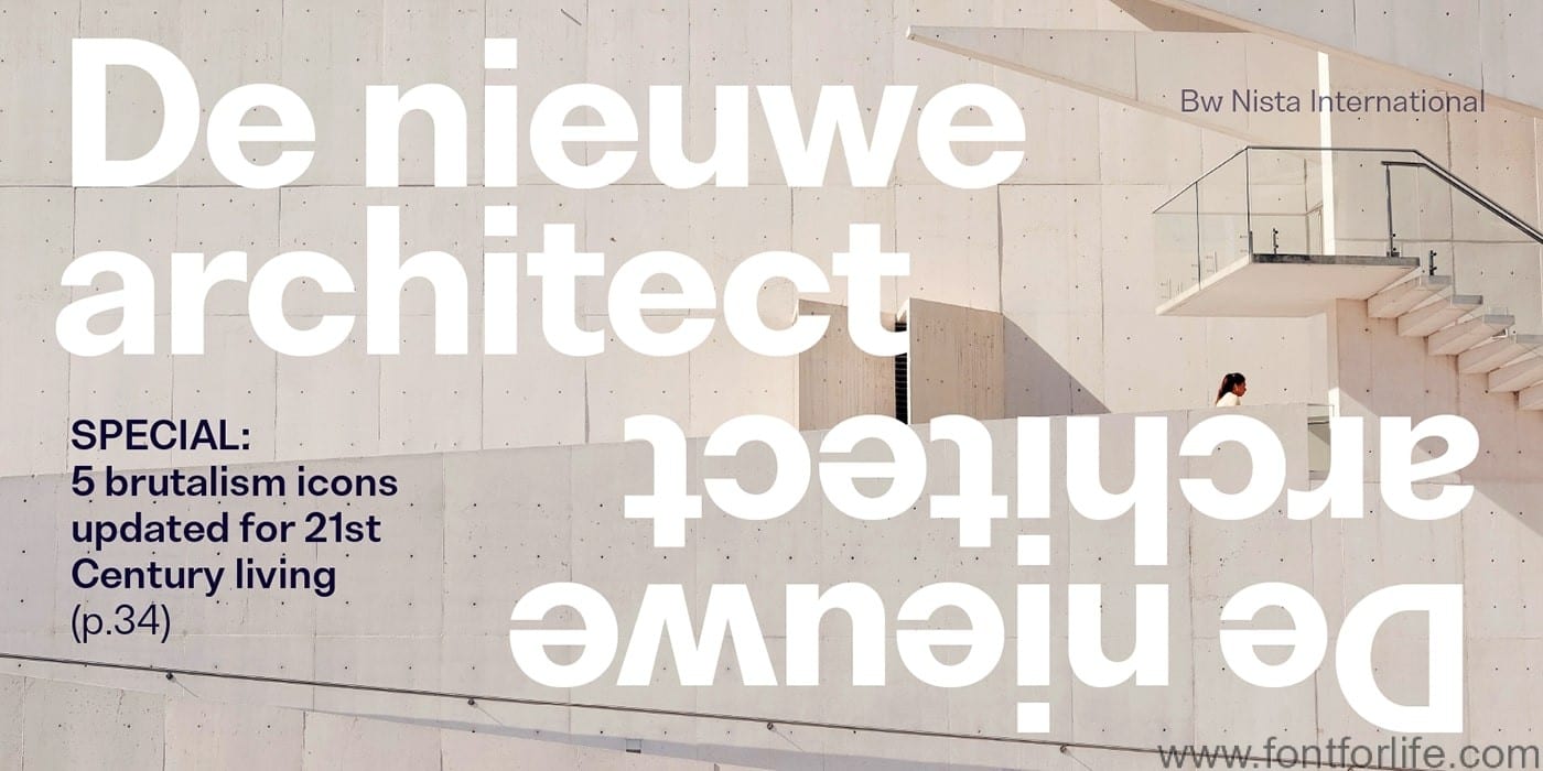 Bw Nista Grotesk’s clean shapes are peppered with subdued quirky details, marrying the warmer feel of the early grotesques from the 19th Century with a contemporary approach. Bw Nista International taps into the utterly functional grid-based Swiss style thanks to its strict and rational shapes, removing all quirkiness of its Grotesk sibling, while Bw Nista Geometric offers a minimalistic interpretation of the genre, achieving an even simpler and cleaner feel.