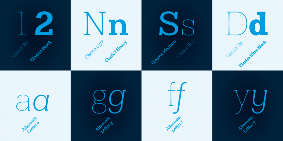 The font family “Clasica” is ideal to cover every design need. Excellent for titles, paragraphs, magazines, books, editorials and logos. The particularity and identity of this font is found in the thinness of its vertical strokes and symmetrical serif. Inspired by the “Optima” font but with a serif that gives a different and new feel. “Clasica” counts with glyphs for the letters: a, e, f, g, r and y. This font family comes with 9 different weights with their respective italics.