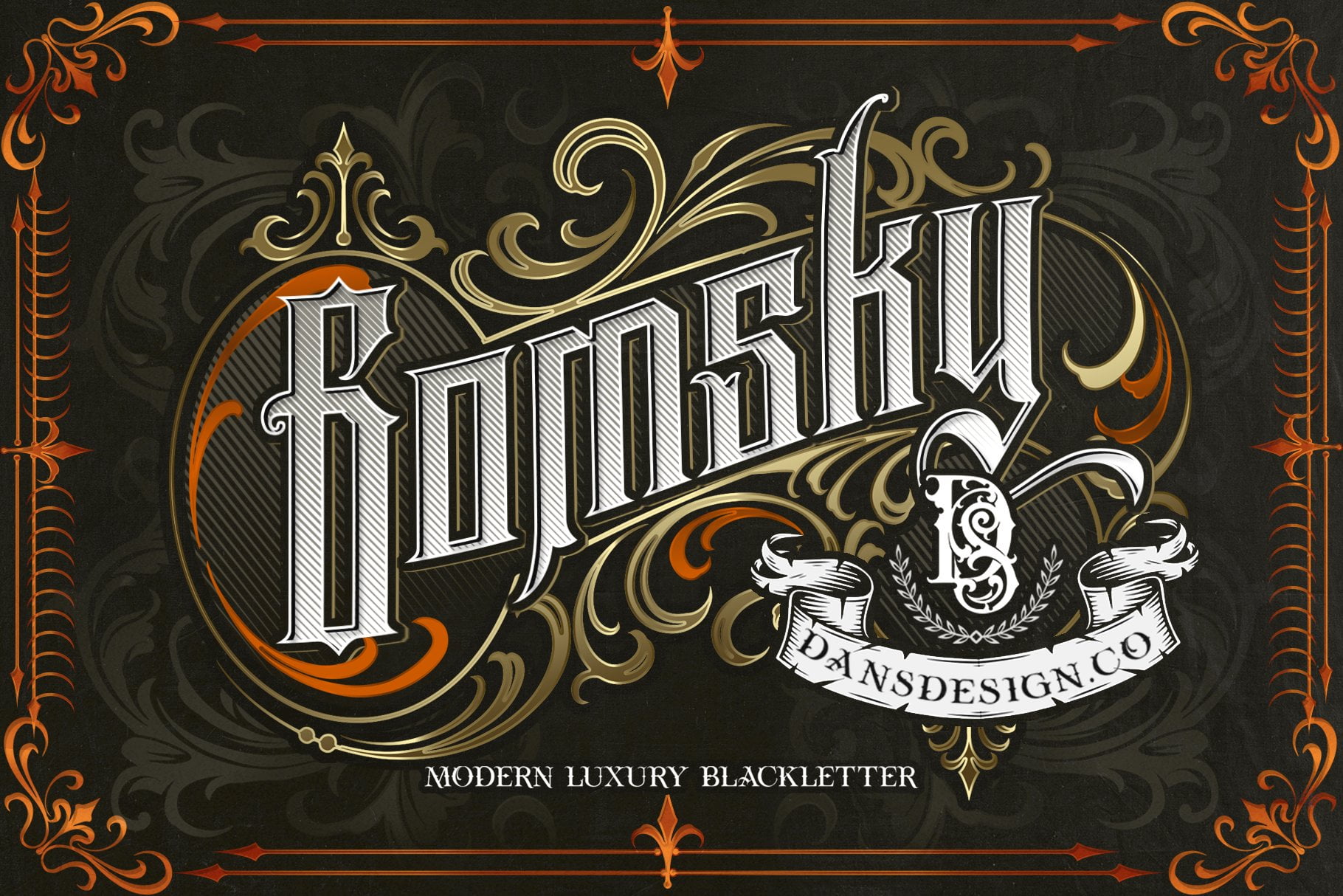 Gomsky a distinct, highly detailed, and chic blackletter font. It would make a great choice for exquisite retro-urban designs, tattoo business branding, logos, vintage designs, and more.