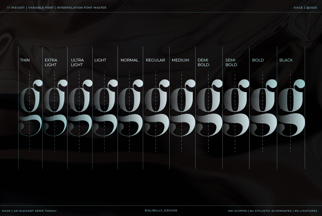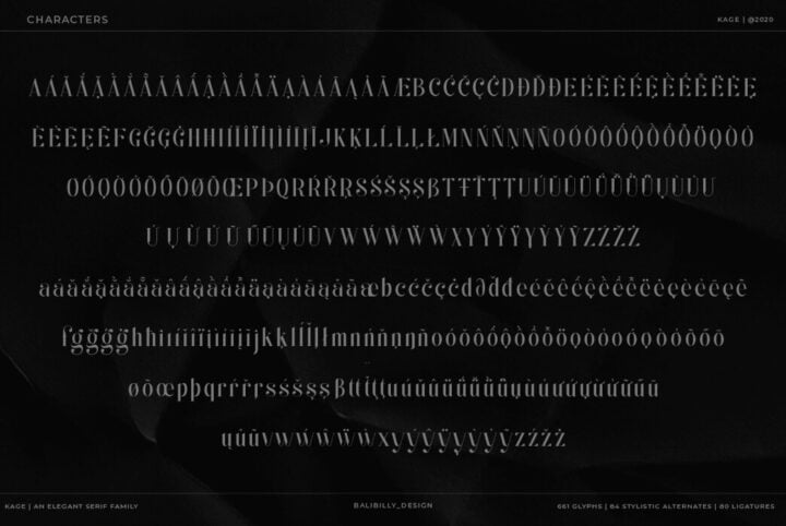 Introducing the elegant and unique font KAGE. This style has become a TREND this year. The idea was to incorporate some of the edgiest looks of modern luxury fashion. Its aim is created with a careful approach to make it as simple as possible to use by accessing stylistic alternate letters and ligature in OpenType features. Just jump from ss01 to ss04 and vice versa to rock your next design.
