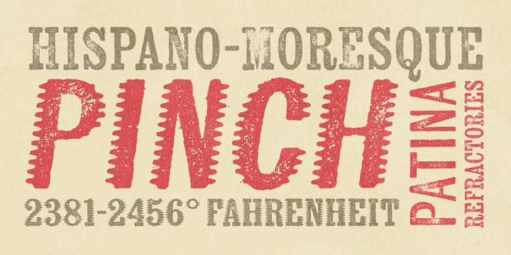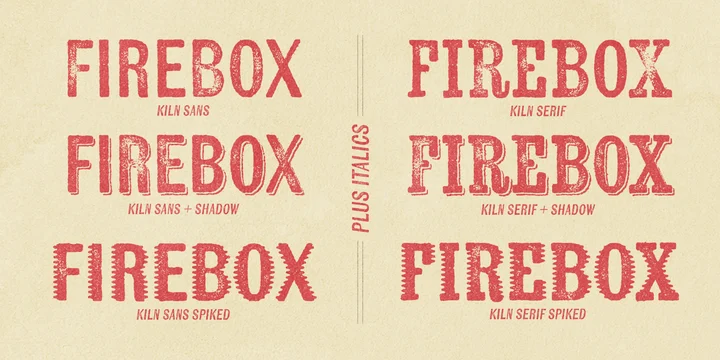 Kiln from Yellow Design Studio is a timeworn, hand-crafted type family with serif, sans serif, and unique spiked versions. It’s a historic revival with modern twists. All letters have 2 distress options for added realism and customization. Other features include shadow layers, automatic double-letter ligatures (to avoid adjacent letters with the same texture), italics, and multiple language support. Kiln has a high level of detail which looks authentic even at large sizes.