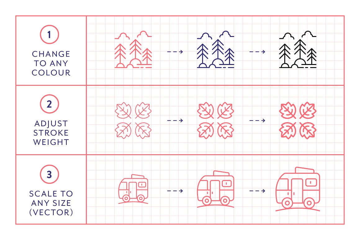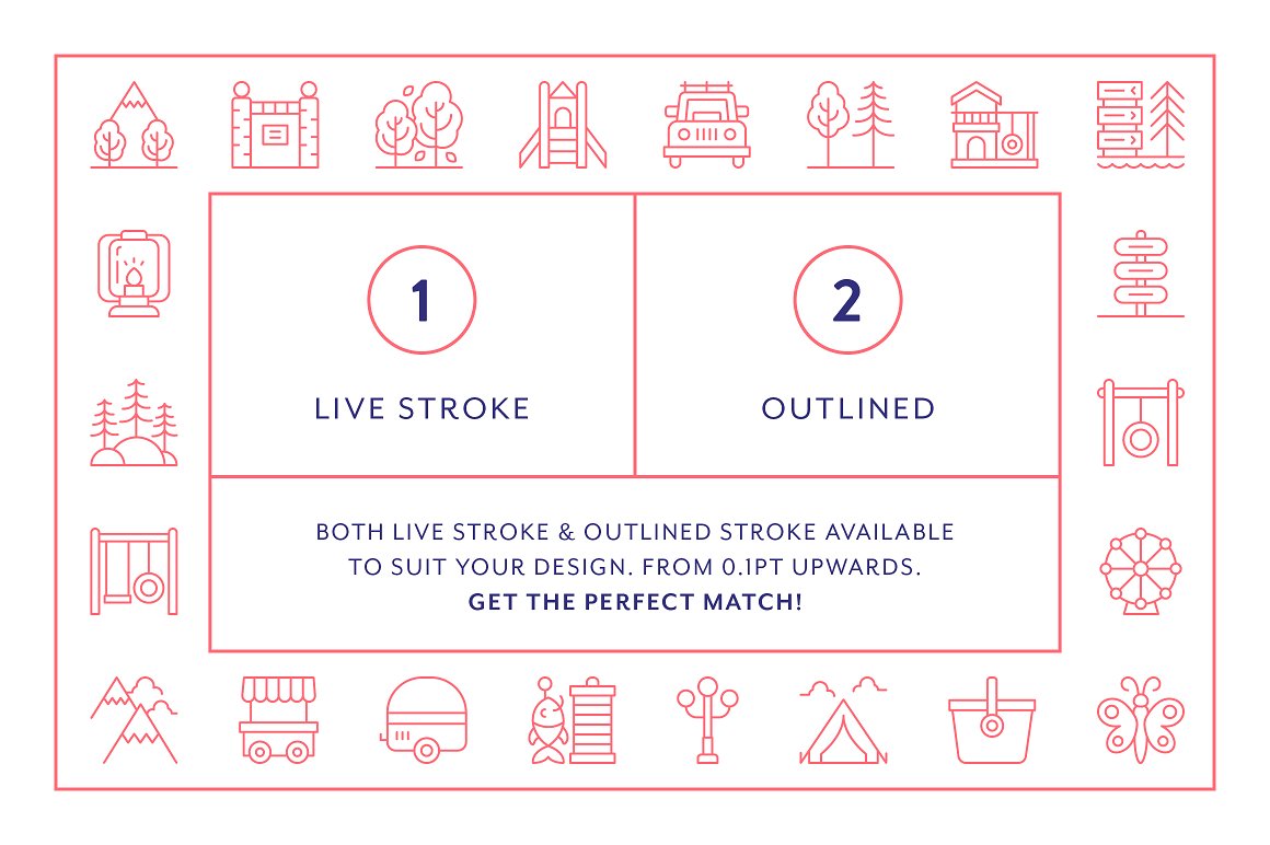 A fun collection of 100 ‘park’ themed vector line icons suitable for web, print, symbols, infographics and apps. This set includes icons for outdoors, activities, camping, holidays, adventure, trees and many more park-related topics.