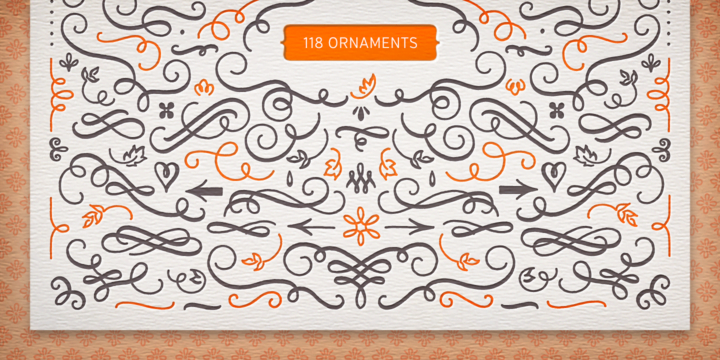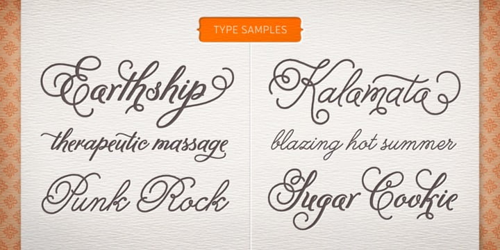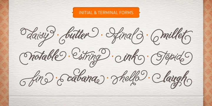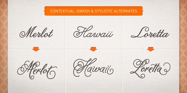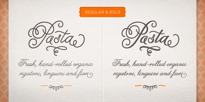 Melany Lane from Yellow Design Studio is a flourishy script based on traditional letterforms, but with the added quirks and warmth of hand-drawn type. The base character set has traditionally connected letters and an expressive charm. Contextual alternates add flair with unconnected letters and additional contour options. Mix in swash and stylistic alternates for extra funkiness and fun. Melany Lane features regular and bold versions, 118 eclectic ornaments (also in regular and bold), and a free set of 14 seamless background patterns. It includes over 1300 glyphs and 364 ligatures that create interesting letter combinations and fix overlapping letter pairs. Opentype features including contextual alternates, swash, stylistic sets, ligatures, initial and terminal forms and old-style figures. It performs best with opentype friendly applications.
