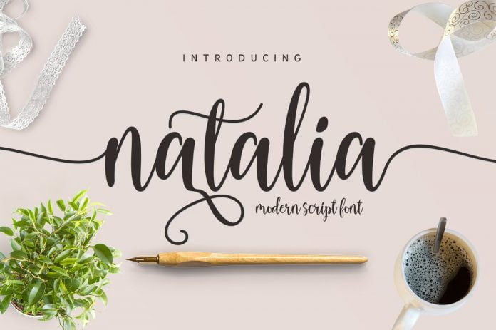 Natalia Script is a calligraphic manuscript modern, dynamic and pretty with swashes. Can be used for many purposes. such as title, signature, logo, wedding invitations, letterhead, signage, labels, newsletters, posters, badges, etc.