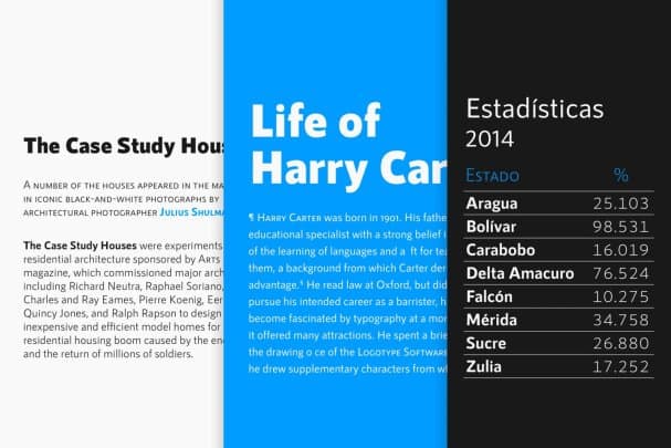 A neutral workhorse for any purpose, rational, clear, clean and functional: 7 weights, ramping from light to black, with small caps, files prepared for webfont use. Ideal use on signage systems and rational architecture.