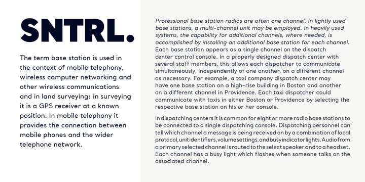 The sharp and precise design of Santral leads to a clear and reliable communuciation with the reader. 12 weights and italic versions, including kerning values and Opentype layout features provide all typographic equipments to get the best result for the typographic layouts.