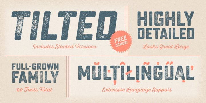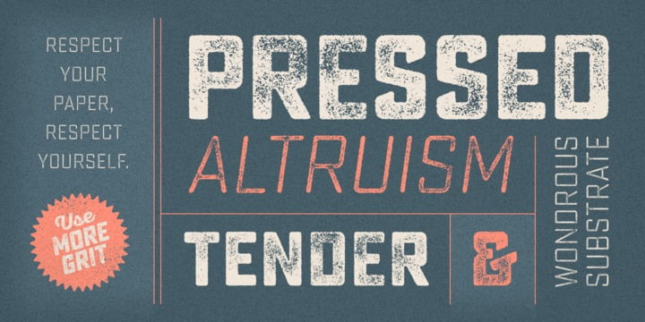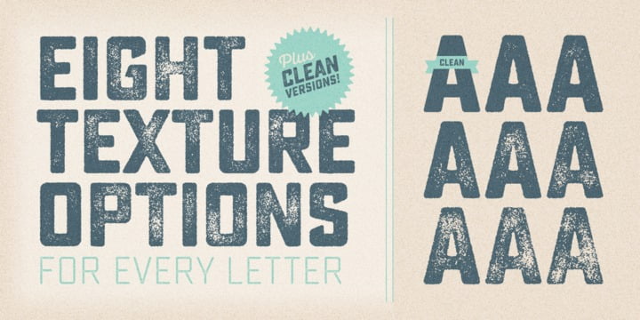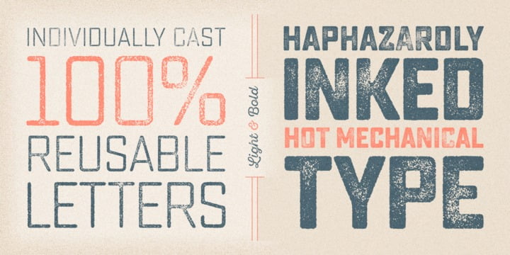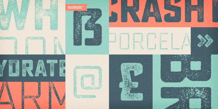 Sucrose from Yellow Design Studio is a premium high-resolution letterpress family with rectangular letterforms and authentic, hand-crafted texture. It features 8 distress levels for all letters (4 for other characters) that can be mixed to create realistic, custom typesettings. The 20-font family includes light and bold weights plus clean and slanted versions. Try the demo weights for free!