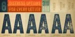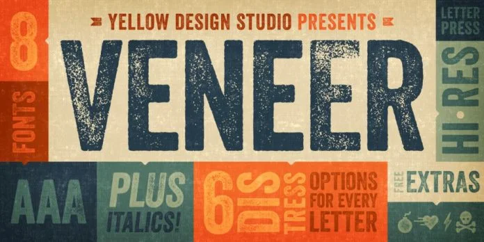 is a high resolution hand-crafted letterpress font family that’s vintage and authentic with a touch of grunge. It’s highly customizable with six distress options for every letter and three for all other characters, and because it’s remarkably detailed, it looks great even at very large sizes. In addition it includes a matching set of funky extras…for free! The Veneer family includes Veneer, Veneer Two, and Veneer Three with Veneer containing the least distressed characters and Veneer Three the most. Mix and match as desired to create realistic letterpress type. TIP: In Photoshop Veneer looks best with anti-aliasing set to “smooth”. Because of Veneer’s high level of detail, it may process more slowly in some applications.