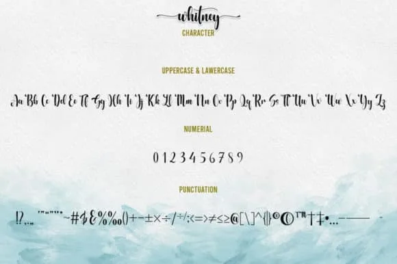 Whitney is a delicate, elegant and flowing handwritten font. It has beautiful and well balanced characters and as a result, it matches a wide pool of designs. Add it to your most creative ideas and notice how it makes them come alive! This font is PUA encoded which means you can access all of the glyphs and swashes with ease! It features a varying baseline, smooth lines, gorgeous glyphs and stunning alternates