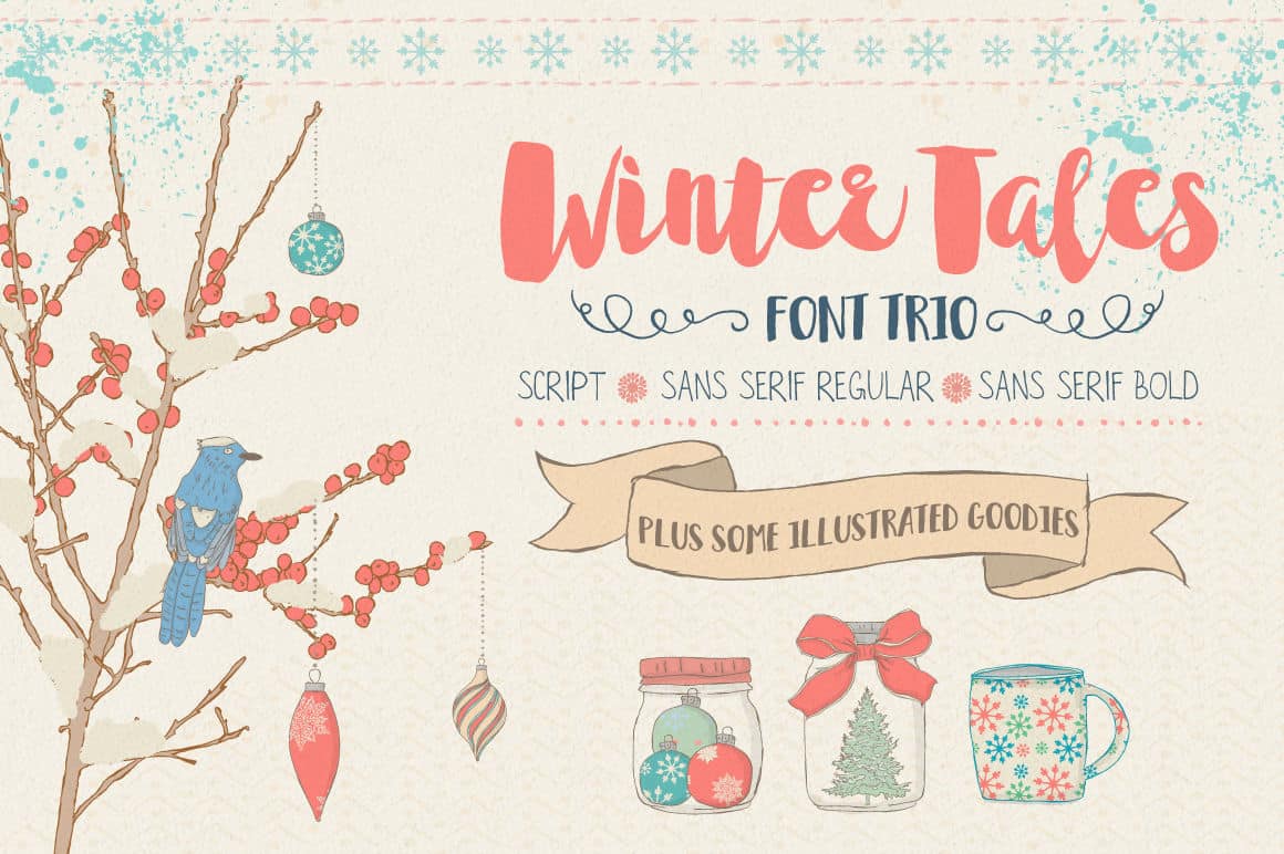 This trio has script version, san serif regular and san serif bold. It will be a lots of pleasure to create your designs with these three “guys”. For even more fun there are lots of hand drawn vector illustrations, seamless patterns, swirls and textures included.